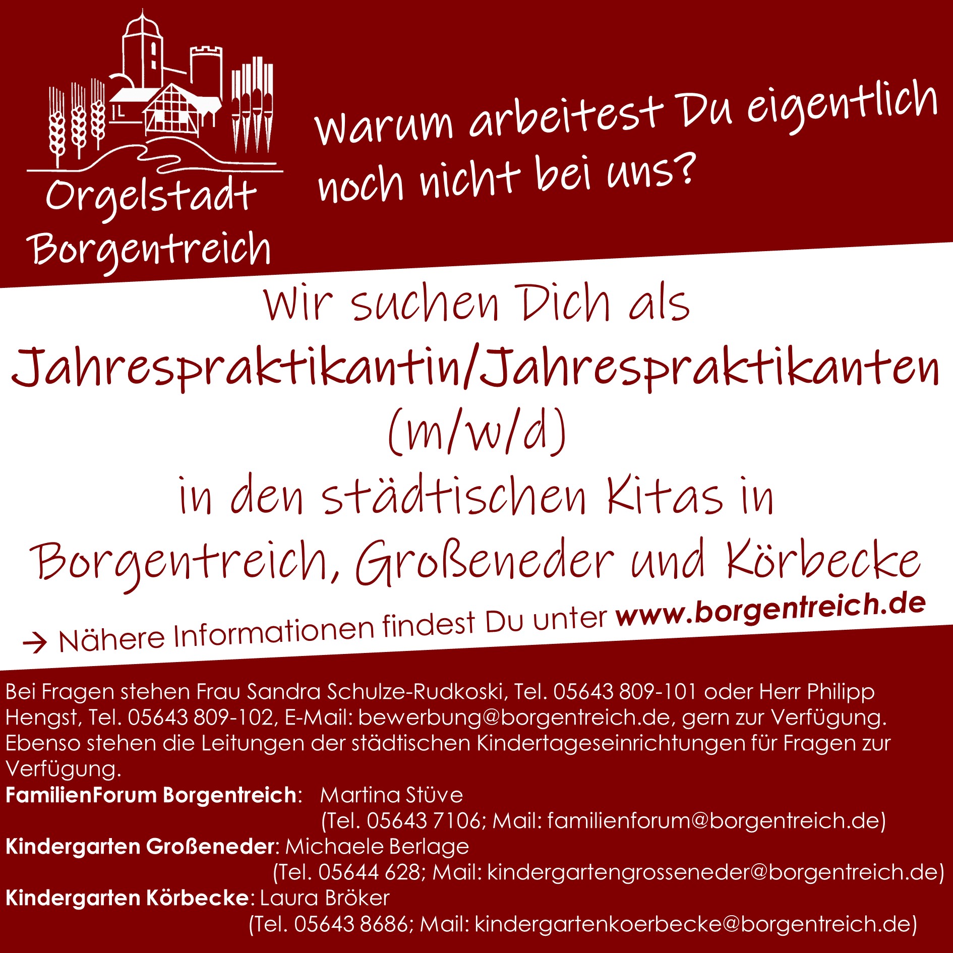 Bei Fragen können Sie sich gern an Sandra Schulze-Rudkoski, Tel. 05643 809-101 oder Philipp Hengst, Tel. 05643 809-102, E-Mail: bewerbung@borgentreich.de, wenden.